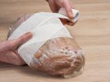 - Um es in Form zu halten, muss man es jetzt zusammenbinden. Diese Aufgabe kann man sehr vereinfachen mit elastischen Binden. Einfach einwickeln und so in Form bringen (Ablaufbild 2).